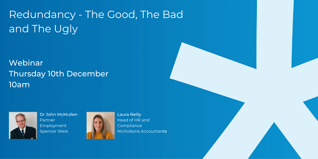 Proudly hosted by Nicholsons Accountants and law firm Spencer West LLP, this webinar is presented by Laura Reilly – Head of HR and Compliance at Nicholsons Accountants and Dr John McMullen, Employment Partner at Spencer West LLP.